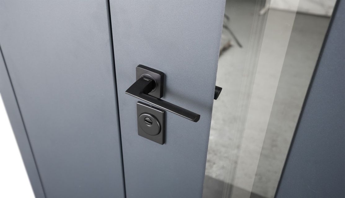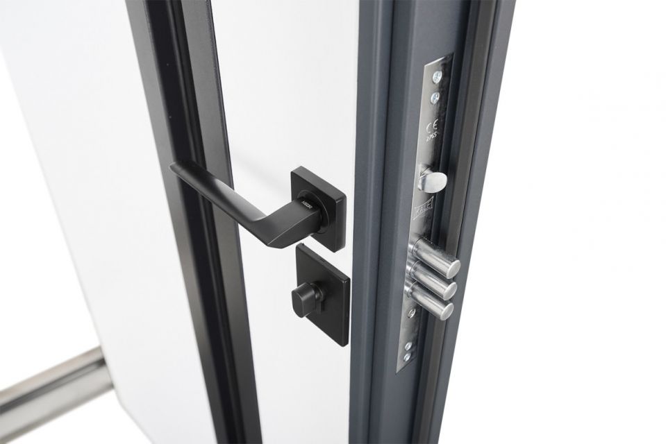 • Фурнітура: двокамерний склопакет, ручка роздільна, 6 зовнішні петлі, антизрізи 2 шт, броненакладка, регулятор притвору, нержавіючий поріг