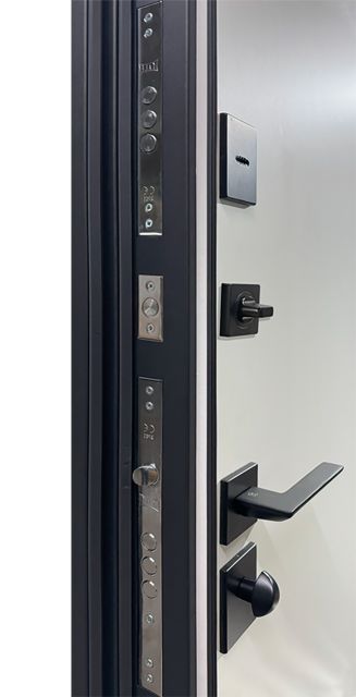• Фурнітура: чорна ручка на розетці MODO BARSA black, антисрізи, 3 зовнішні петлі, поріг з нержавіючої сталі, нічна засувка