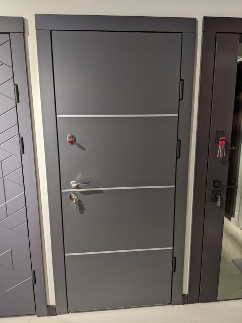 - Фурнітура: 3 петлі, ручка на розетці, втоплена броненакладка, нержавіючий поріг
